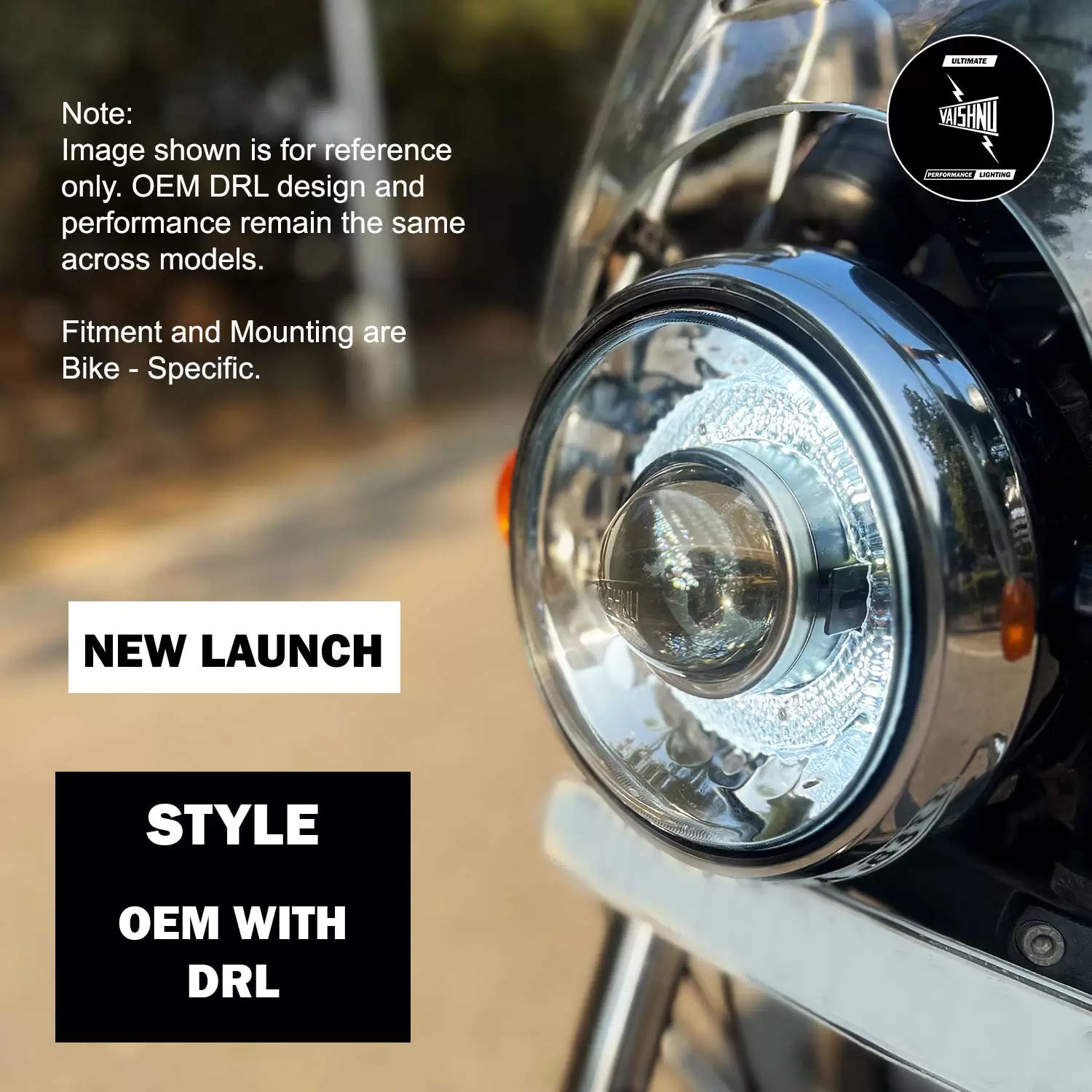 That’s not all! While our Primary Focus was to get the Performance of the Product Top Notch, We did not want to miss out on the Aesthetic appeal too. That’s when the Elegant DRL makes the Headlight Eye Catching and a Treat to the Soul when you watch your Royal Enfield Classic 350 (2025 Edition) & Goan Classic from a Distance. Moreover, the Headlight DRL Design has been kept Simplistic and Classy to Provide a Unique and Distinctive Design that makes your Motorcycle stand out in the Crowd. Also, With the Introduction of the New OEM Style Models the Classic Vintage of the Motorcycle is not lost by upgrading the Headlight for your Motorcycle.